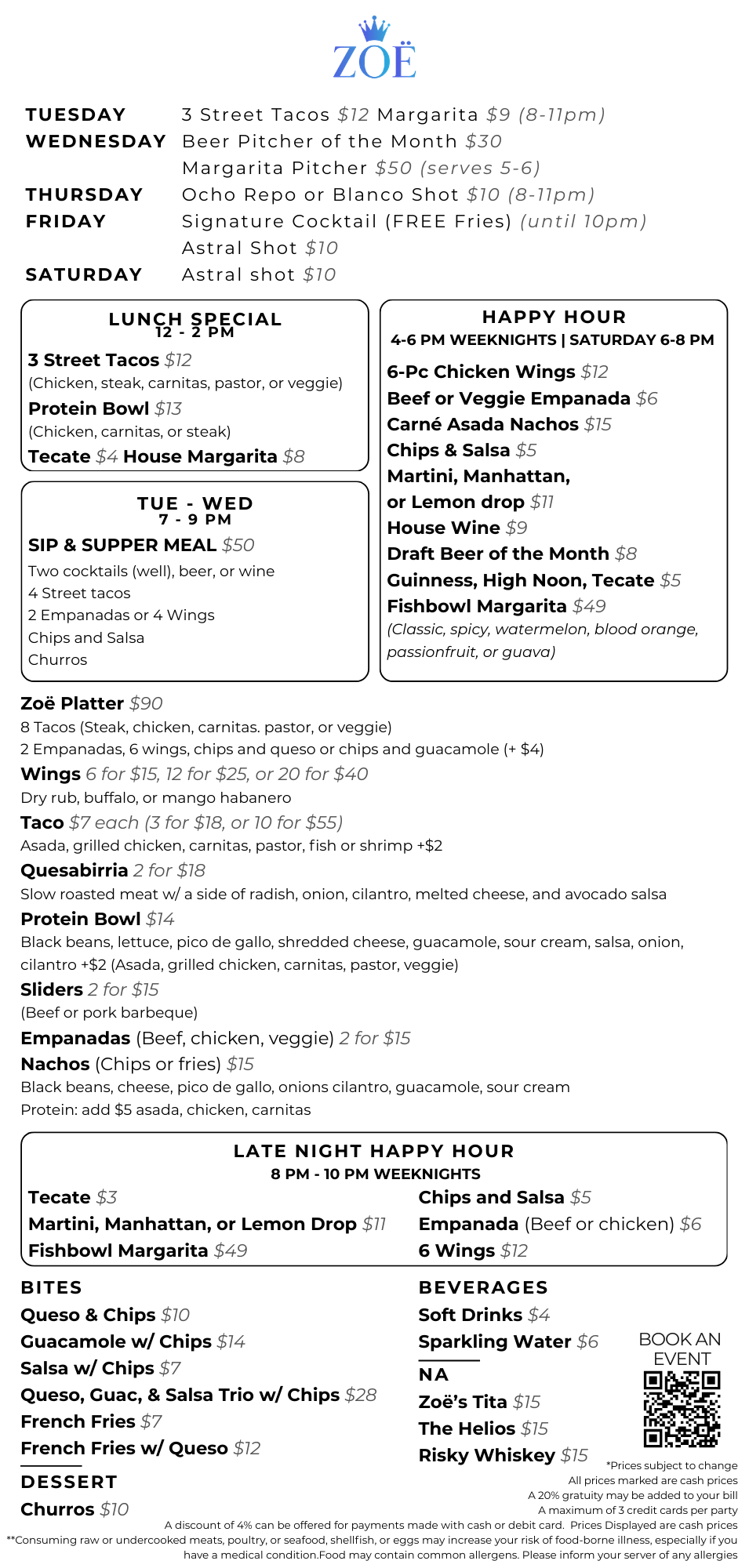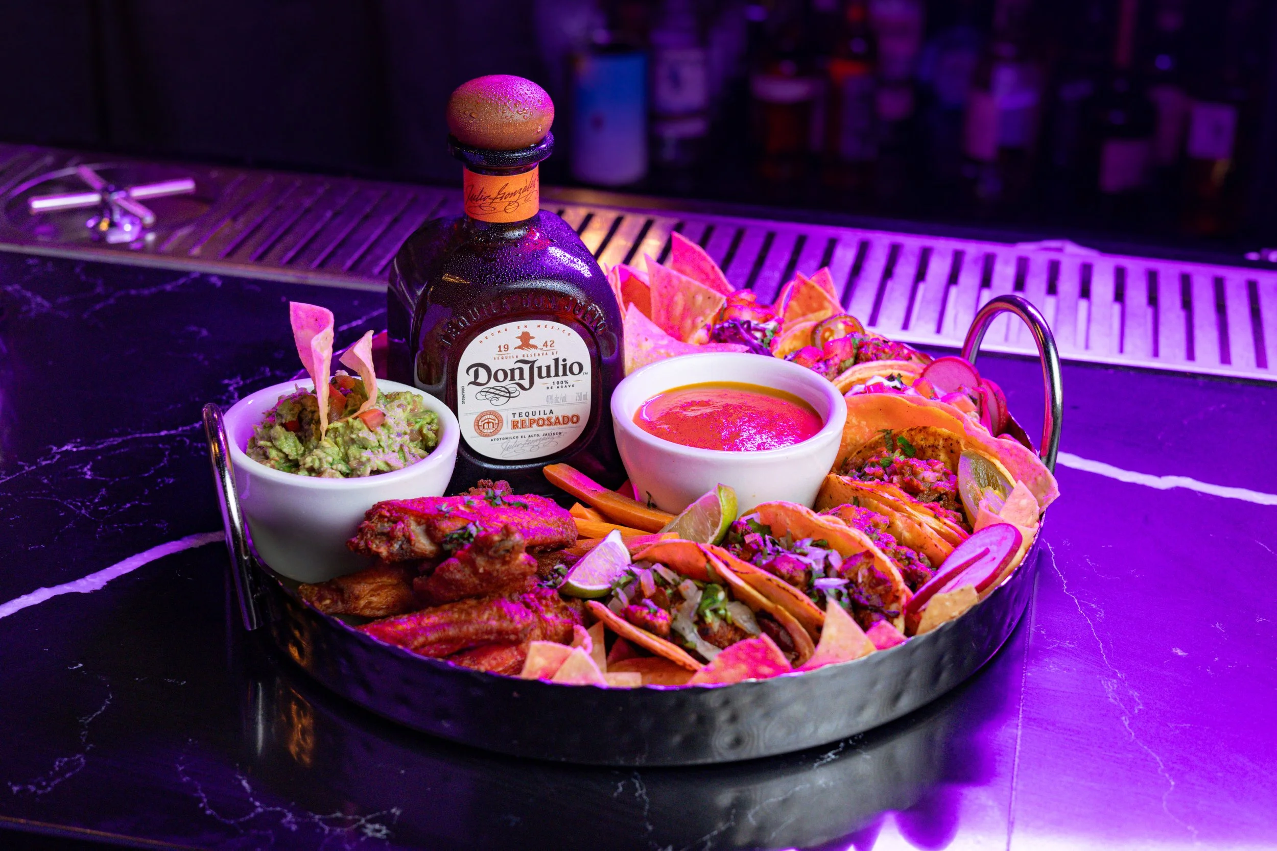 8 Tacos, 2 empanadas, 6 wings, chips & queso